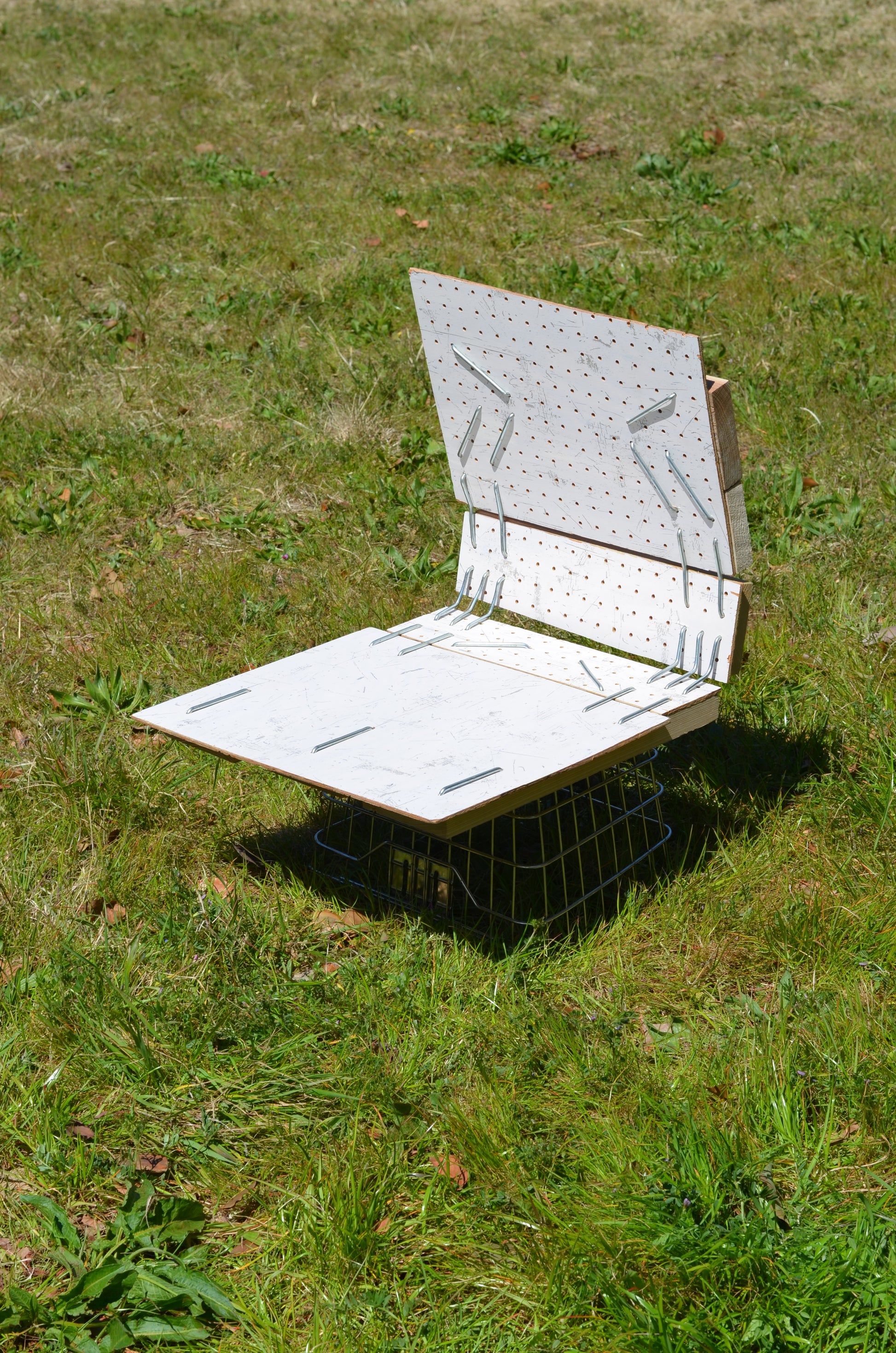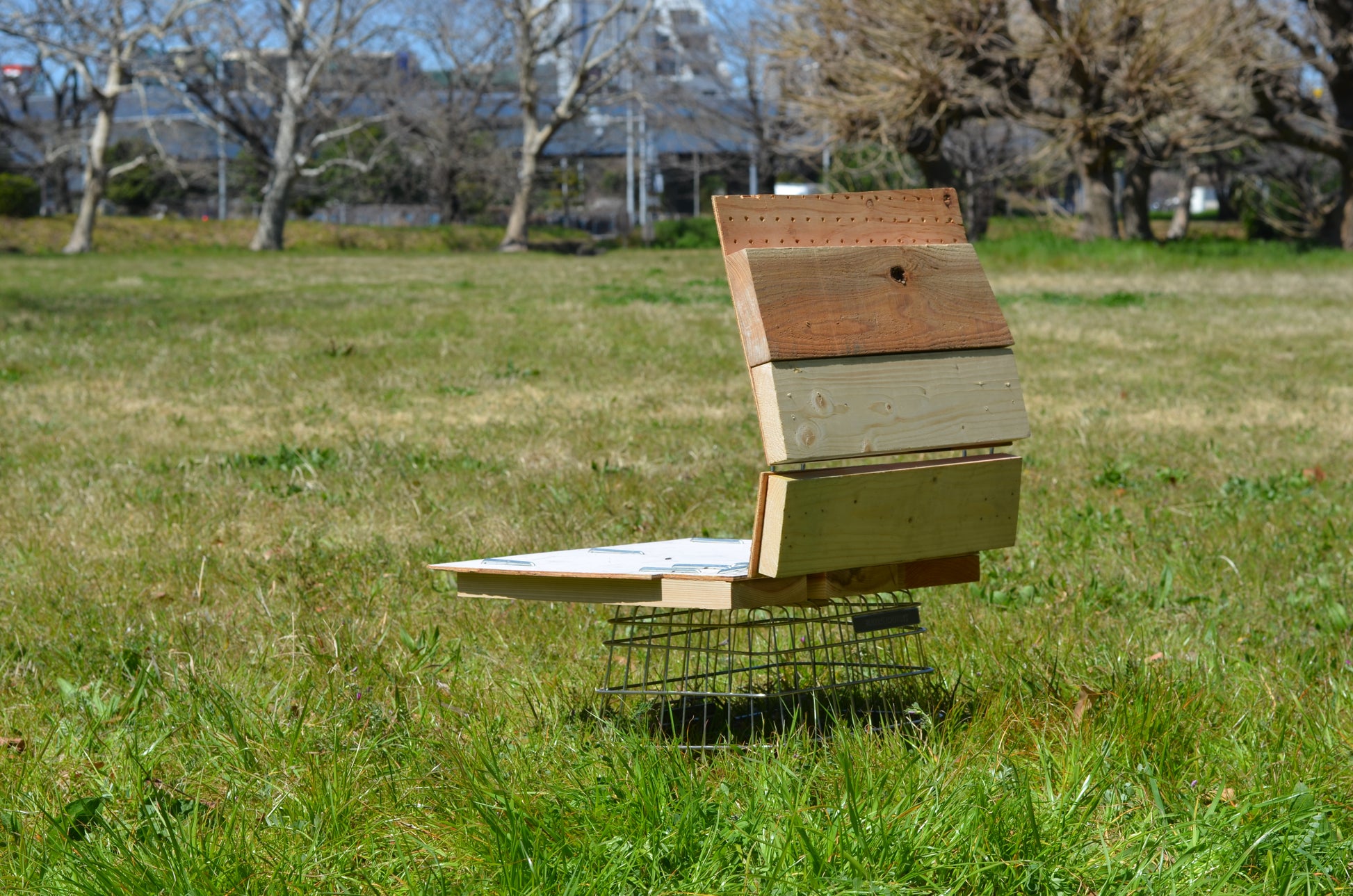 素材: パンチングウッドパネル、再生木材、再利用金属製自転車用バスケット。