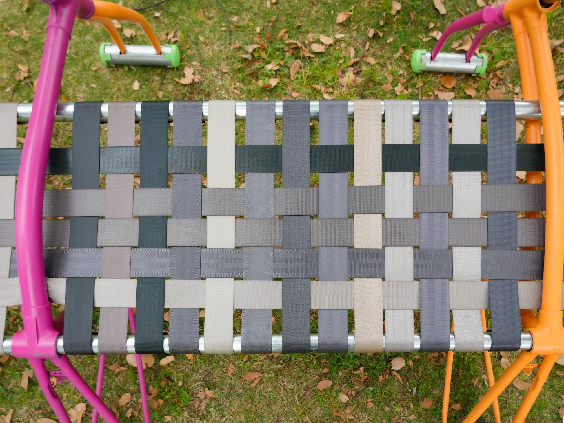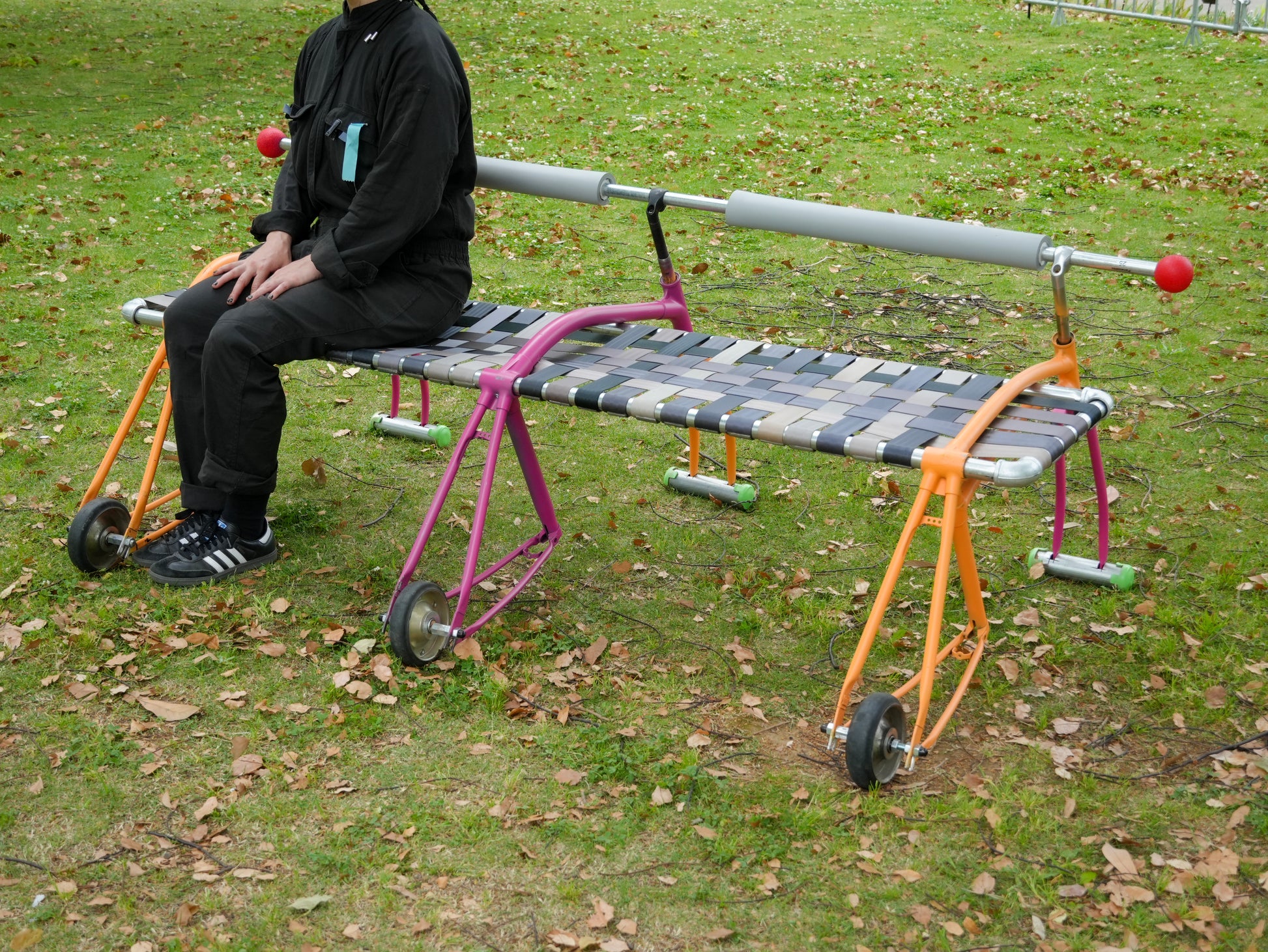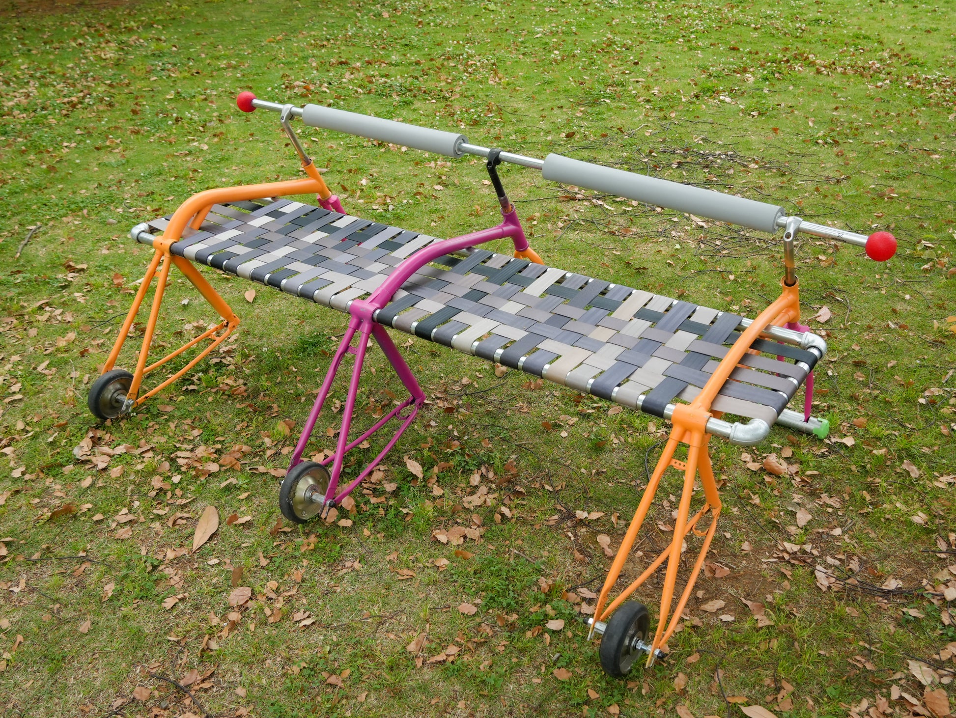 Materials: Repurposed Bicycle Frame, Repurposed Car Seat Belts, Repurposed metal Tubing